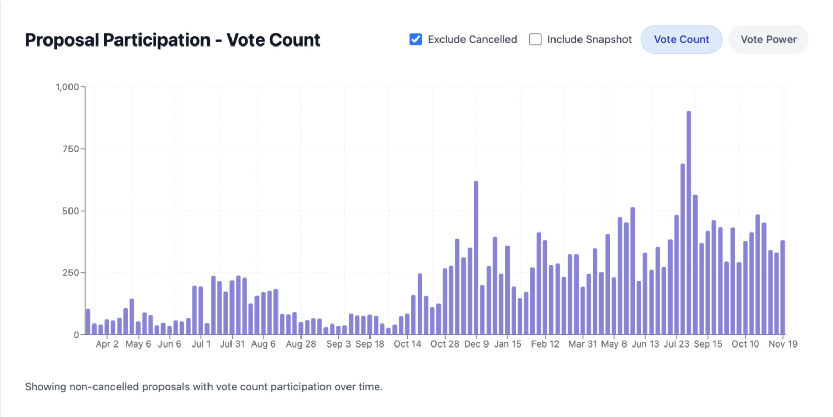 With a monthly average of 377 onchain voters, proposal participation does not deviate from our expectations. The previous five months experienced a voter turnout of 335 in June, 484 in July, 719 in August (a clear outlier), 462 in September, and 382 in October.