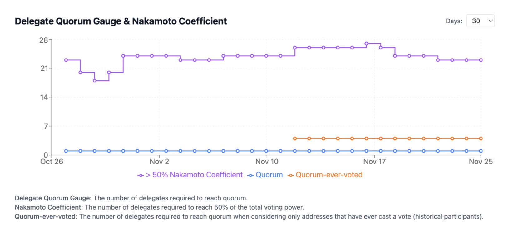 In our last report, we noted that the Nakamoto Coefficient sat at 20 delegates. This month, it climbed to 23 (after briefly hitting 27), indicating a higher degree of governance decentralization. @Wheelhaus also adjusted the dataset to include a Quorum Gauge consisting of wallets that have voted at least once in the past, which we noted in October’s report would result in a more accurate picture of the number of delegates required to reach quorum.